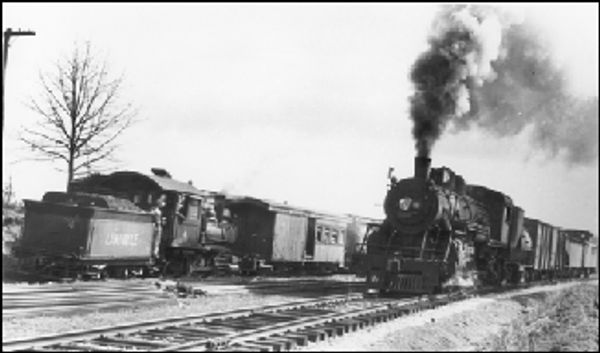 Number One, shown to the left, is seen here pulling an excursion on three-rail track leading into Shelby. Until 1925, the Lawndale used dual-gauge track on either the Southern, and then the Seaboard, to travel its final miles into Shelby.