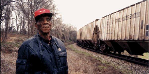 Not much is left of the railroad in 2003, and Nick Wells (pictured), was the last surviving train man. In this photo, he is standing at Lawndale Junction in March, 1999 as a CSX freight roars by on the old Seaboard Air Line trackage.