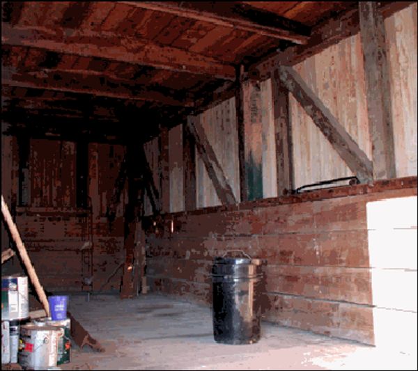 This view shows the interior of the boxcar, where very little restoration was required. Note the arched roof supports, the original planking on the roof, and the plankingon the interior walls, only halfway up.